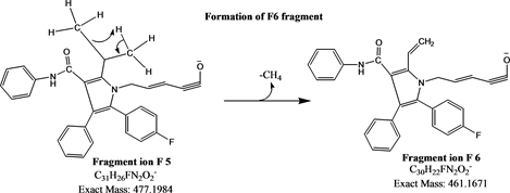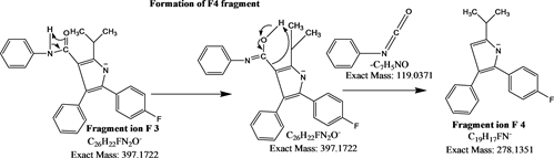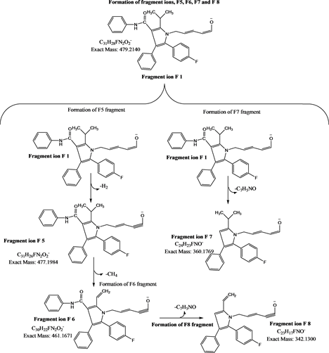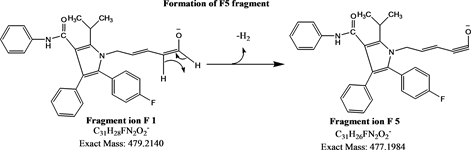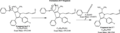 The full scan MS and product ion spectrum of atorvastatin was obtained from MS, product ion (MS/MS) and MS3 experiments. The workflow [18] and other basic mass spectrometric interpretation rules were applied for the interpretation of MS, MS/MS and MS3 spectral data.