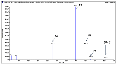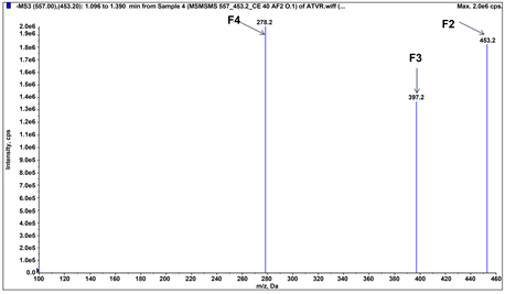 De-protonated parent ion [M-H]− at m/z 557.3 u, from MS scan displayed in Figure 1, negative mode MS/MS spectrum of atorvastatin also exhibited de-protonated ion peak (about; 1.5%) at m/z 557.2 u as [M-H]− (for elemental composition , calculated monoisotopic 557.2 u). It was fragmented in collision cell (Q2), into four major fragments at m/z 479.3 (F1; about 2.5%), 453.2 (F2; about 17.4%), 397.2 (F3; about 61.3%) and 278.1 (F4; about 17.2%) as presented in Figure 2.