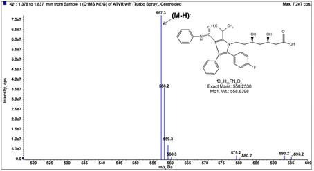 The experimental data (MS, MS/MS and MS3) of atorvastatin was generated using a high performance liquid chromatography (HPLC) coupled with Q-trap and Q-ToF mass spectrometer system; via Flow Injection Analysis (FIA) mode and Electro-spray Ionization (ESI−) ion source.