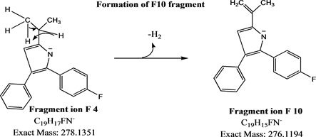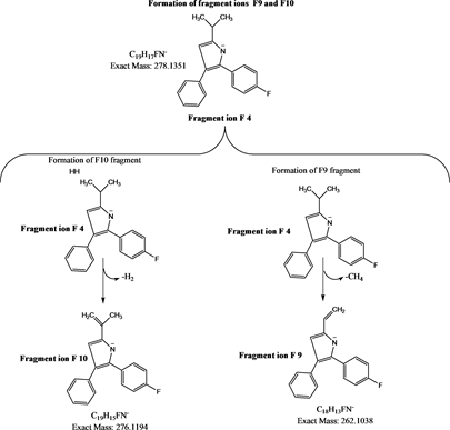 mass 453.2) formed by loss of , C2H3O− and H2, refer Figure 5; product ion m/z 397.2 (F3) (calculated formula C26H22FN2O−, calculated monoisotopic molecular mass 397.2) produced for product ion F1 and F2 by the loss of C5H6O and C3H4O respectively, refer Figure 6. Product ion m/z 278.1 (F4) (calculated formula C19H17FN−, calculated monoisotopic molecular mass 278.1) formed by the loss of C7H5NO, refer Figure 7.