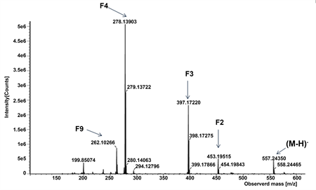 Figure 2. MS/MS spectra of parent ion m/z 557.