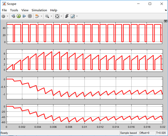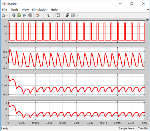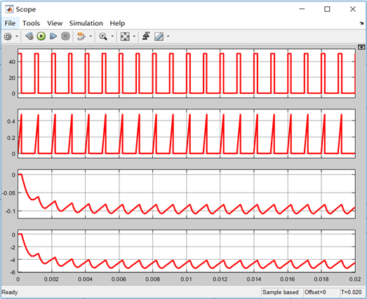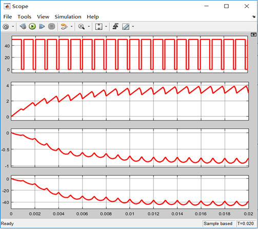 The simulation diagram of the boost and buck chopper circuit is shown in Figures 17-19 respectively represent the simulation waveforms with duty cycles of 20% and 80%. The waveforms in Figure 18 and Figure 19 are represented from top to bottom as follows: pulse waveform, input current, output current, output voltage. By analyzing the waveform diagram, it can be seen that the simulation waveform is consistent with the theoretical analysis.