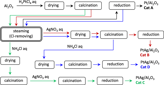 Crushed Al2O3 (Neobead GB, Mizusawa Industrial Chemicals, Ltd., surface area = 190 m2∙g−1) having a 250 - 850 μm size was used for the catalyst preparation. After the sieved Al2O3 and an aqueous solution of H2PtCl4 were added to a 200-ml eggplant flask, they were mixed at 40˚C for 30 min. Water was removed from the flask using a rotary evaporator under reduced pressure, then the obtained pale-yellow granules were dried at 130˚C overnight and calcined at 550˚C for 3 h. Three types (Cat B-D) of PtAg/Al2O3 catalysts were prepared by the following different methods (Figure 1). During the preparation of all the PtAg/Al2O3 catalysts, residual Cl− derived from H2PtCl6 was removed by a steam treatment to avoid AgCl formation by the reaction of a Ag compound with Cl− before the following steps.