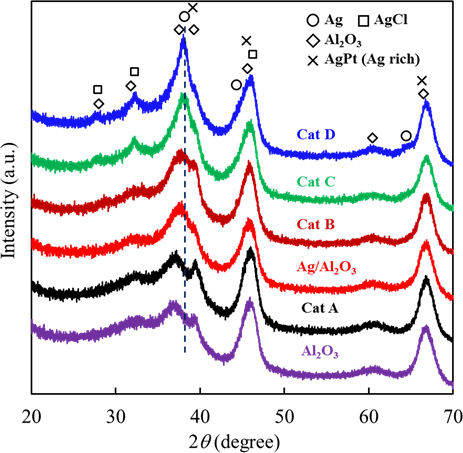 Figure 2 shows the XRD profiles of the prepared Cats A-D with the Ag/Al2O3 and Al2O3. In all the spectra, no peaks assigned to Pt and Pt-based bimetallic compounds were observed due to the low Pt content and the high dispersion of the Pt particles. Meanwhile, the major peak assigned to Ag was clearly observed at 2θ = 38.1˚, and its strong intensity indicated agglomeration of the Ag metal particles. Besides the peaks assigned to Ag, those assigned to AgCl were clearly observed at 2θ = 27.9 and 32.4˚, which was produced by the reaction of Ag and HCl during the catalyst preparation.
