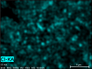 Figure 4. SEM-EDX photographs of PtAg/Al2O3 catalyst Cat D. (a) SEM photograph; (b) EDX mapping for Cl; (c) EDX mapping for Ag; and (d) EDX mapping for Pt.