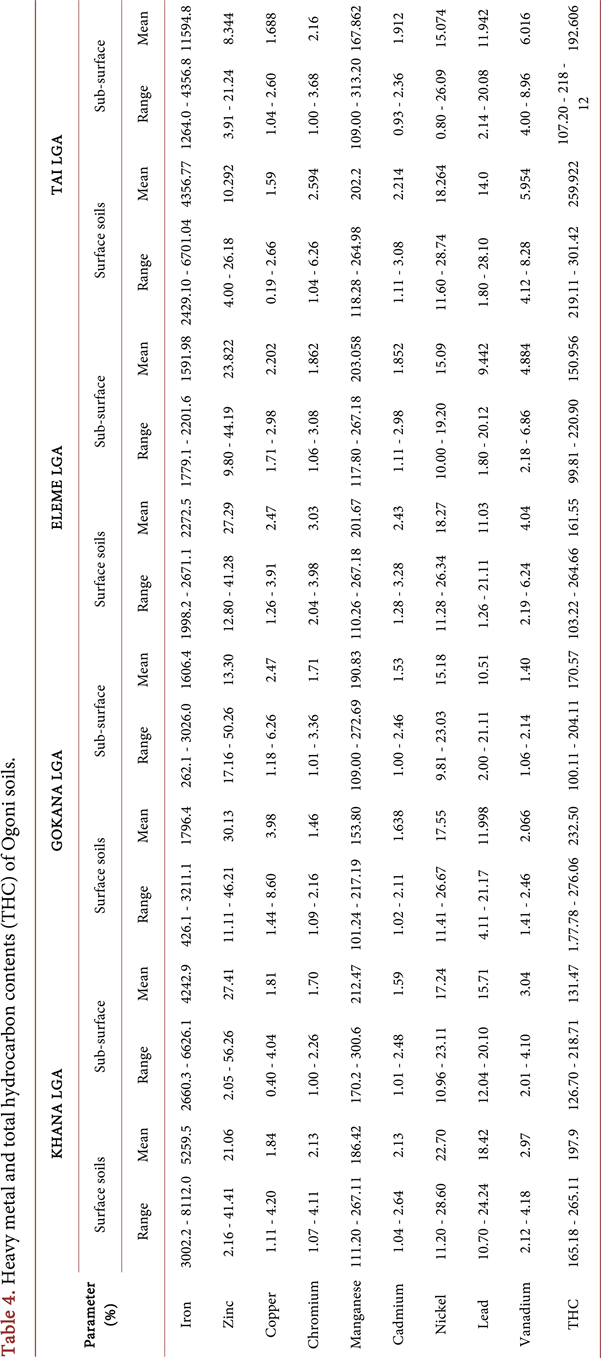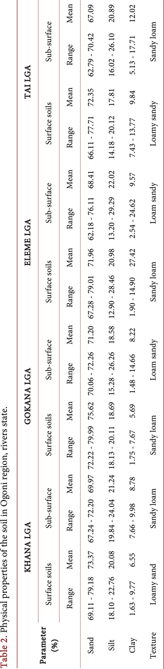 The physical properties of the soils sampled in terms of sand, silt and clay fractions varied in texture along the sampling locations. The texture of the soils sampled along the stations varied from sandy loam and loamy sand texture depending on the pedogenesis and edaphic features of the study area. For example, Tai and Khana LGAs correspond to areas with loam sandy and sandy loam for surface and subsurface soils respectively, while Gokana and Eleme LGAs indicates sandy loam and loamy sand respectively for surface and subsurface soils. The soils are characterized as coarse-textured with a high proportion of sand fraction exceeding 70%, 22% for silt and 8% for clay fractions. Thus, the soils of the prescribed study area are declared contaminated by heavy metals and hydrocarbon toxicity, though contaminated by metals but not significant. Also taking cognizance of the sandy loam and loamy sand texture, medium in organic carbon contents, the soils have weak surface aggregation and inherently medium in fertility status.