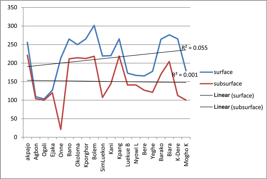 In summary, despite the values of the heavy metals, the soils are within the threshold limits established in typical mineral soils [25] [20]. The high contents of nickel and vanadium (often associated with heavy metals) may be attributed to the activities in the region although the nature of the parent materials may not give sufficient explanation. Thus, the soils of the study area are declared contaminated by heavy metals and hydrocarbon toxicity. Taking cognizance of the sandy loam and loamy sand texture, medium organic carbon contents, the soils have weak surface aggregation and inherently low fertility status. Figure 4 further attempts a coefficient of determination, R2 which is a measure of the total variation in surface soils in Ogoni region that is explained statistically or determined by the distribution of subsurface soil. Therefore, a coefficient of determination, R2, of 0.005 and 0.001 for both surface and subsurface respectively indicates that none of the variation in surface soil can be attributed to a linear