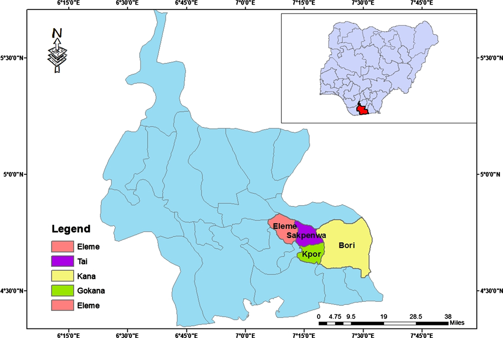 The Ogonis are indigenous ethnic minority group in Rivers State in the Niger Delta region of Nigeria (Figure 1). Ogoni has an area of 1046.4 square km, which lies between longitude 7˚2'00"E and 7˚18'30"E and latitude 4˚18'30"N and