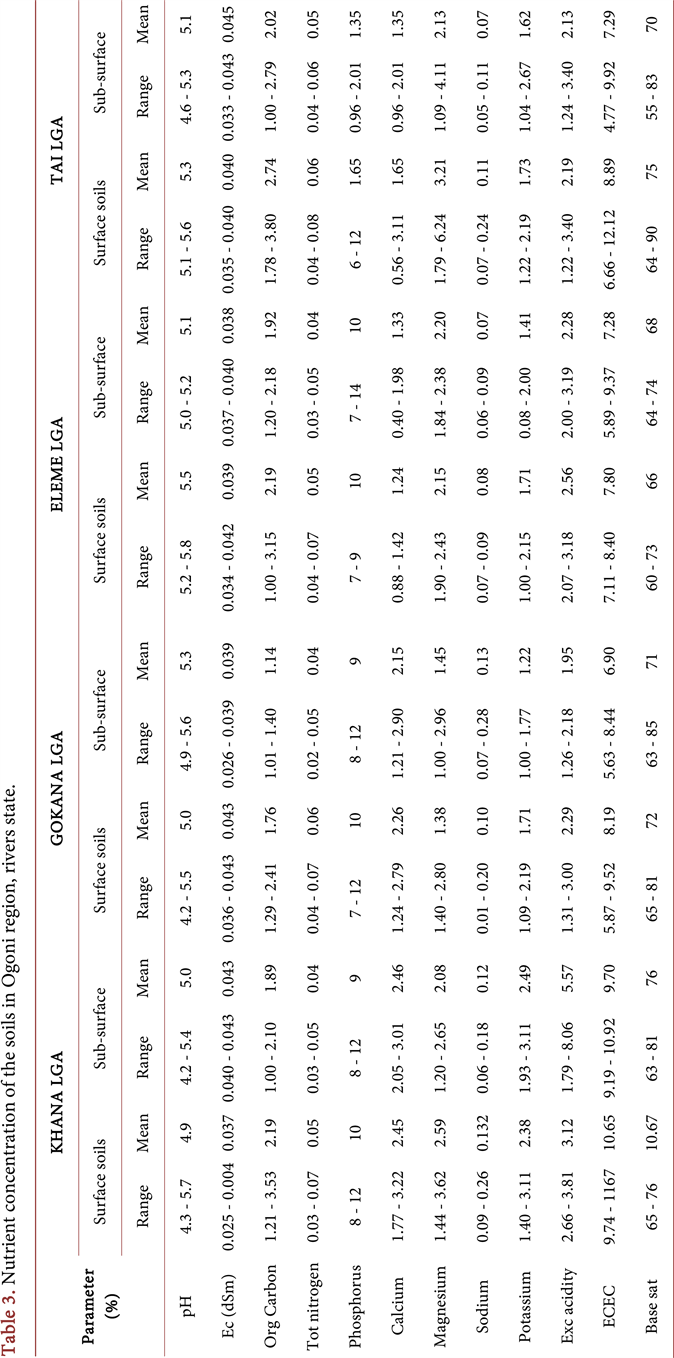 reduces susceptibility to erosion [20]. The organic carbon in soils of the study area ranged from 1.00% to 3.80% and between 1.00% to 2.79% for surface and subsurface soils respectively across the prescribed stations (Table 3). Such soils are rated medium in fertility status [21]. The results indicate that organic carbon decreases with depth in all the stations used for this study. From the results, Tai station recorded the highest level of organic carbon contents, while the lowest content was obtained in Eleme, Tai and Khana of the ecological zone. Thus, in spite of the level of pollution, the soils can sustain crop production in the ecological zone.