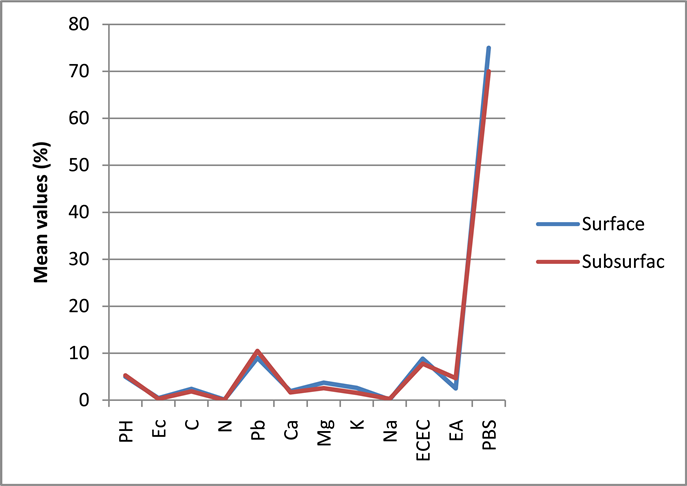Mean lead (Pb) contents are low and ranged from 1.26 to 28.10 mg kg−1 and 1.80 to 20.12 mg kg−1 for surface soils and subsurface soils respectively (Table 4). Thus, mild variation in Pb contents in soils of the study area was recorded. These values are within the maximum tolerable limits of 2 - 200 mg kg−1 for the soils ecological settings [25] [26].