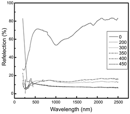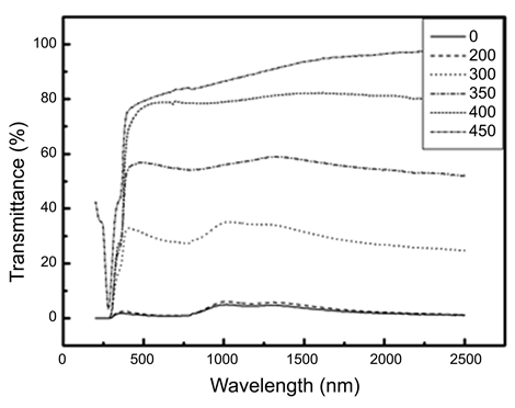 The typical UV-VIS-NIR optical transmittance and reflectance spectra of annealed films (Zn100−xCdx with x = 4 at%) at different annealing temperature as a function of wavelength in the range from 300 to 2500 nm are shown in Figure 4 and Figure 5 respectively. It is clear that the transmittance increases and the reflectance decreases with increasing the annealing temperature from 200˚C to 450˚C. In Figure 4, the drop-off of the values of transmission belonging to the shorter wavelengths was related to the fundamental absorption by band-to-band transition. Meanwhile, the wavelength of the absorption edge decreased with an increase in temperature of annealing.