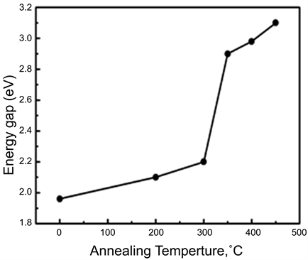 From the transmittance data it is possible to infer the optical energy gap of the films by plotting (αhυ)2 vs hυ (where α is the absorption coefficient, and hυ the photon energy) and by extrapolating the straight line portion of this plot to the energy axis. The obtained values have been plotted in Figure 6. The optical band gap Eg increases with increase in annealing temperature and found to be equal to