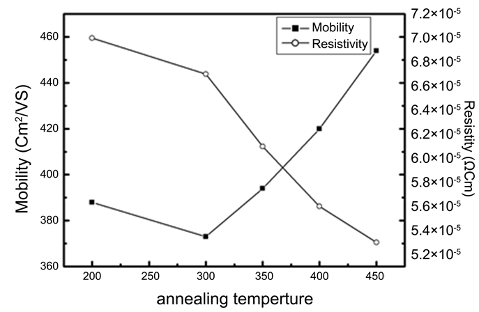 to 450˚C showing semiconductor behavior. The lowest resistivity value 5.3 × 10 − 5 Ω-cm has been obtained for annealed film at temperature of 450˚C. It is observable also that, the carriers mobility increased with increase in annealing temperature. This may be due to the increase of the grain size with increase in annealing temperature, and this leads to reduction of the grain boundary scattering due to charge carriers. The decrease of the electrical resistivity of annealed films is due the increase of the mobility carriers.
