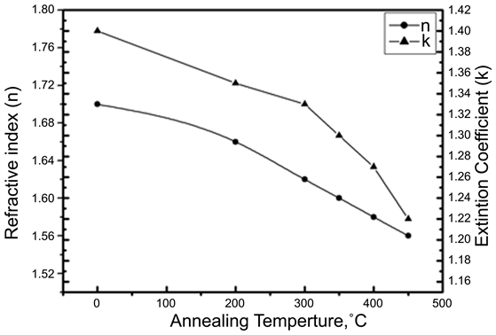 The variations of refractive index and the extinction coefficient in the visible wavelength range of (Zn100−xCdx with x = 4 at%) films annealed at different temperature are depicted in Figure 7. The refractive index of the films decreases with increasing the annealing temperature which can be attributed to the decrease in the packing density with annealing temperature. On the other hand, the extinction coefficient (k) decreases with increasing the annealing temperature, which can be attributed to the increase of the film transparency [23] .