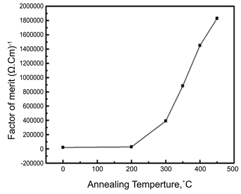 In order to predict the selective properties of transparent conductive coatings from the fundamental optical and electrical properties, the factor of merit can be employed [26] where Tm is the average transmittance in the visible region and r is the electrical resistivity. Figure 9 shows the variation of the factor of merit as a function of annealing temperature. The figure indicates that the best value of annealing temperature is at 450˚C.