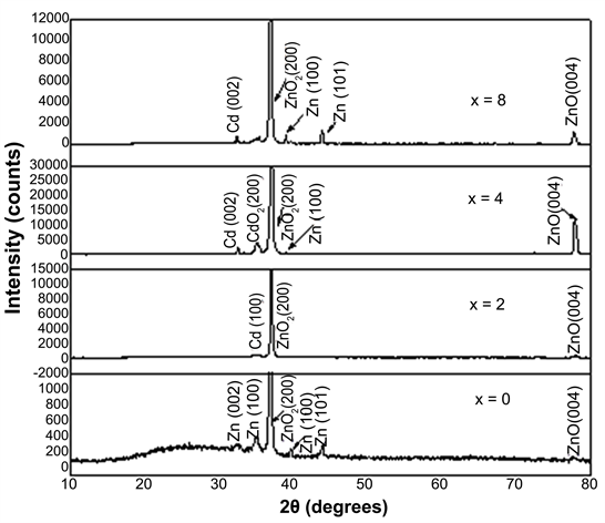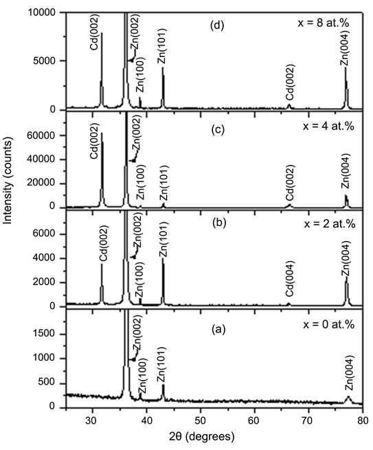 The X-ray diffraction patterns of annealed Zn100?xCdx (x = 0, 2, 4, and 8 at%)