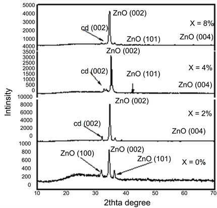 appear at 2θ = 31.50˚, 34.17˚, 35.95˚ corresponding to ZnO in the direction (100), (002) and (101) plane. For x = 2% Figure 3(b) the main peaks appear at 2θ = 31.75˚, 34.39˚ for Cd (002) and ZnO (002) respectively.