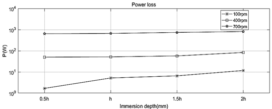 Figure 3. The effect of the immersion depth on power loss at three different rotational speed.