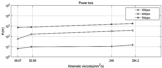 In general, the churning power losses increased with the increase of the rotational speed and the immersion depth as well as the viscosity, which the rotational speed has the greatest influence on the churning loss. Minimum effect on the power loss is oil type named GL-5 75W80. The difference reaches tens of watts between 100 rpm and 400 rpm but runs up to hundreds of watts at the range of 400 rpm to 700 rpm. The turbulence of oil increases with the rotational speed, which causes higher oil power loss.