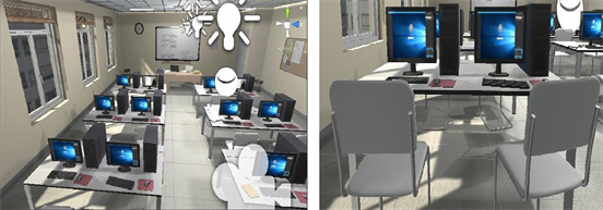 attention to the choice of light source and the uniformity of materials. Since the teaching system only involves indoors, the point light source and spotlight can be selected to restore the scene better [5]. When the light source is determined, in order to save resources and facilitate modification, we can use unity 3D’s baking function to fix the shadows, making the classroom more realistic [6]. The result of the construction is shown in Figure 2.