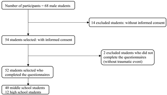 Students who participated in this work were 54 adolescents in detention and their age is between 13 and 17 years, who continue their study according to two grade levels, 40 at the college and in high school 12 (without taking into account the terminal of high school because their age is more than 17 years), but 2 teenagers who have not completed the questionnaires, this is how they had treated data from 52 teenagers. Figure 1 shows the final sample of the students who have completed the entire procedure of inquiry. The crimes of these teenagers are varied: armed, homicide, robbery, rape, theft and setting up a criminal gang.