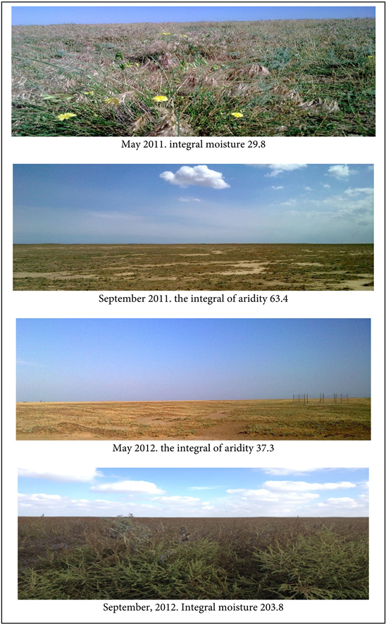 Moisture integral for the same months in 2011 years was 29.8. In 2012 and 2013 years curve of moisture fell below the curve of mean daily air temperatures, therefore, aridity integral was formed, which was respectively by years, and 37.3 and 98.9. Difference in his performance between the first and the two subsequent years was 67.1 (2012 year) and 128.7 (2013 year) and impact significantly on the productivity of ephemeral synusia. Mainly for this reason, the yield of living above-ground phytomass latest for 2012-2013 years decreased compared to 2011 year respectively, 9.2 and 1.5 times.