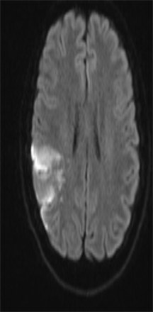 Figure 1. Right Sylvian ischemic stroke. MRI of 24-year-old female patient (DAX hospital center).