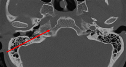 Figure 4. CT scan of the skull base shows the absence of the right carotid canal. 24-year-old female patient (DAX hospital center).