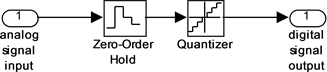 The analog to digital converter is illustrated in Figure 5. It is composed of a zero order hold block and a quantizer block. The zero order hold block is used to transform the analog signal to the discrete signal and the quantizer complete the transformation from the discrete signal to the digital signal. Even through this model just presents the ideal conversion process but not consider the non-ideal factor of an actual ADC, the effect of the quantized bit number can be investigated. However, in order to investigate the non-ideal effect of an actual ADC, a more detailed model of ADC is needed to replace this model.