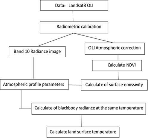 An important information source for the urban surface temperature is the thermal band 10 of the Landsat 8 OLI sensor. The necessary atmospheric correction method has been adopted. The total amount of thermal radiation observed by the satellite sensor subtracts the estimated atmospheric influence on the surface thermal radiation. The resulting surface thermal radiation intensity is then converted into the corresponding surface temperature (Figure 5).