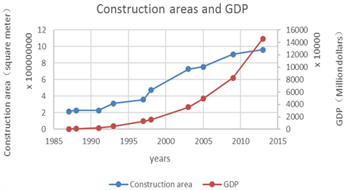 Economic growth is closely related to urbanization and the GDP growth is the most fundamental factor in the expansion of urban land use [8]. Since the reform and opening up, Shenzhen’s economy has been developing rapidly. Figure 7 displays the relation between construction areas and the GDP. The value of R2 fitting of 0.8 indicates the correlation between them.