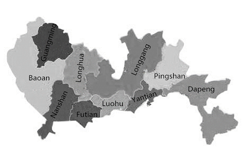 The city of Shenzhen is adjacent to Hong Kong and located in the south of the Guangdong Province. Its coordinates are as follows: east longitude 113˚46' - 114˚37'; north latitude 22˚27' - 22˚52'. Shenzhen is characterized by a subtropical monsoon climate with pleasant wind and rich precipitation. The city has 6 administrative districts and 3 new districts (Figure 1), with a total area of 1997.27 square kilometers. By the end of 2017, the resident population of Shenzhen summed up to 12,528,300.