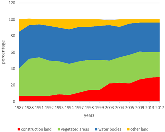 From Figure 2, it can be deduced that water bodies and vegetated areas are the most prominent categories. Vegetated areas decreased significantly while the water bodies decreased just slightly in the past 30 years. They changed from 45% and 33% to 36% and 30%. Whereas the areas are reduced, the changes are visibly not obvious. Caused by urbanization processes, the category other lands began to decrease, from 15% in 1987 to 4% in 2017. The area of construction land increased from 7% in 1987 to 30% in 2017 by more than a factor of 4. From Figure 3 we learn that the category construction land tends to increase in the future and will expand in all directions.