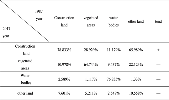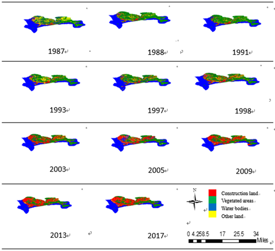 1) Between the years 1978 and 2017, the types of land use changed significantly. The results show an increase of the construction land, and a decrease of all other classified categories with vegetated areas and other lands more significantly than the water bodies. All types of land use categories are mutual converted.