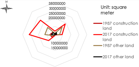 The classification grid map was transformed into a vector map based on ENVI and used as input to ArcGIS software. ArcGIS was used to draw an eight-direction circle and to fuse it with each land type to see their respective expansion in the distinct directions.