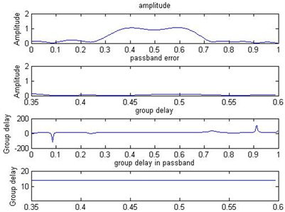 Our all filter designs are realized in Matlab R2009b. WCA function is obtained from [8]. Figure 1 shows the performance of design result by our proposed method. From Figure 1, we can know the magnitude-frequency characteristicmeets the requirement while the group delay in passband is the approximate linearization.