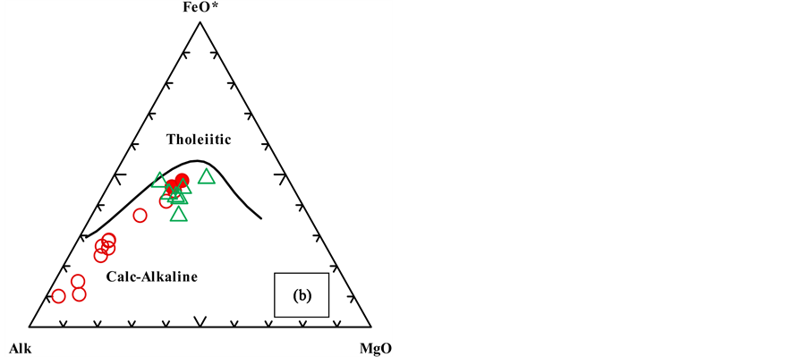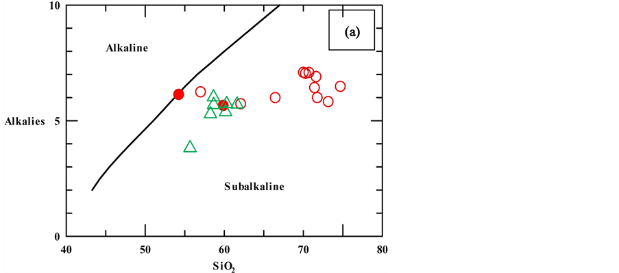 All samples shown low-K affiliation based on the K2O versus SiO2 figure of [14] (Figure 5(a)) and are sub-alkaline relation and relate to the calc-alkaline set from the [15] distribution system (Figure 5(b)).