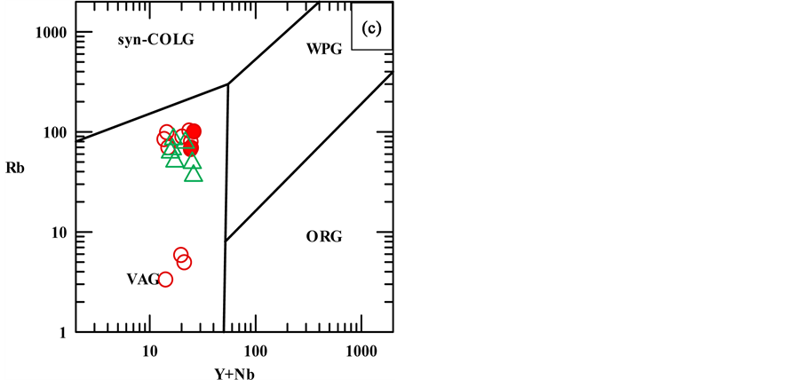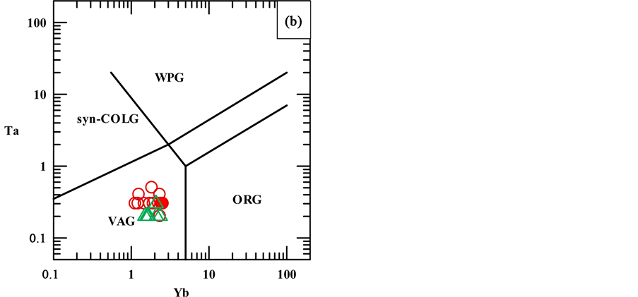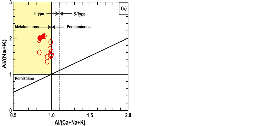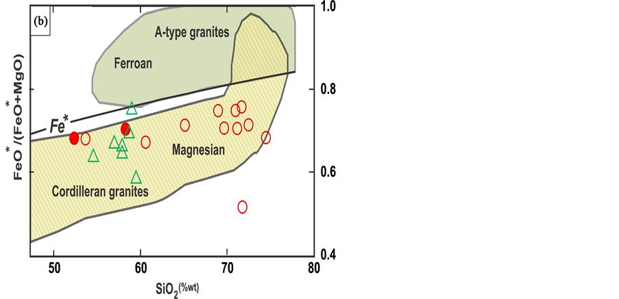 [A/CNK versus A/NK] figure [11] the quartz-diorites structure, granodiorites, monzogranites scheme to the meta luminous area. The rate of The molecular A/CNK of these rocks are in the range of [1 - 1.1] of A/CNK (Figure 3(a)), so the stones were of I-kind in the presence of [12] , so, these rocks fall in magnesian type of granitoieds and related to cordillerian types of grnitic rocks (Figure 3(b)) [13] .