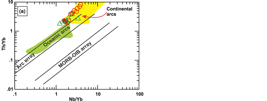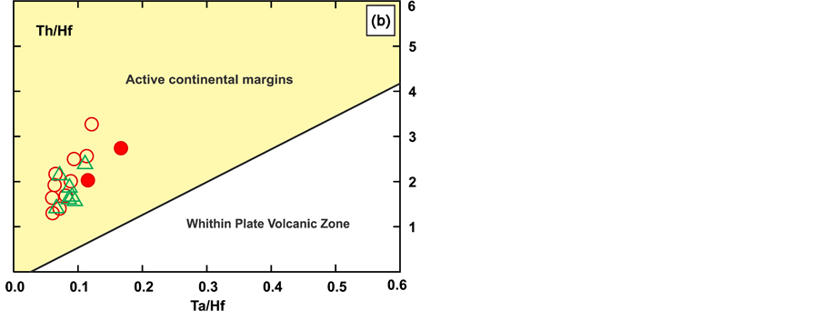 Figure 7. (a) Th/Yb ratios vs. Th/Yb are compatible via continental arc magmas. (b) Ta/Hf ratios vs. Th/Hf Pearce (2008).