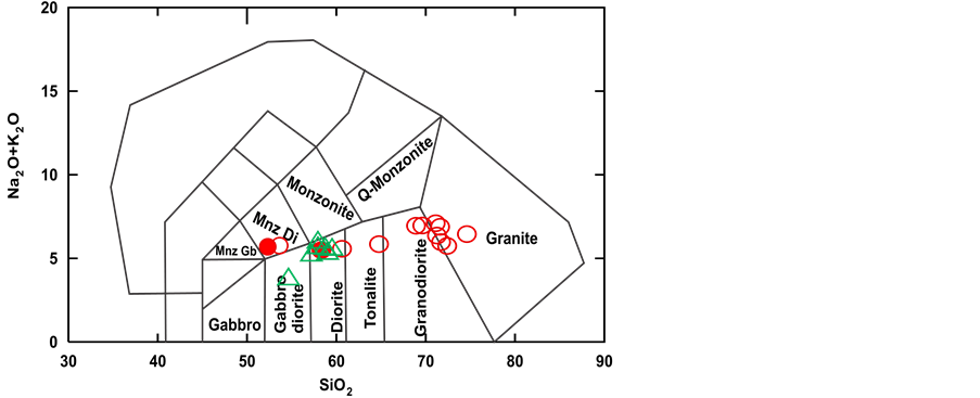 Figure 2. Total Akkali versus SiO2 f for major factors of the Chahar- Gonbad Granitoid complex.