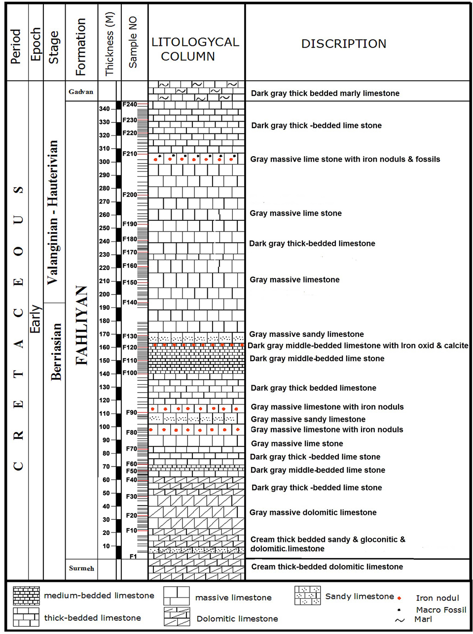 Based on Alavi (2004) [17] , Zagros is divided into three major structural zones which are Simply-Folde, Imbricated and Metamorphic zones. Kuh-e-Siah stratigraphic section is located in Simply-Folded zone of the Zagros. Actually, structure of the Kuh-e-Siah is referred to an anticline with SW-NE trend similar other structures of the Zagros area [18] . It consists of well exposed of Jurassic though Cenomanian sequence (Surmeh, Fahliyan, Gadvan, Dariyan, Kazhdumi and Sarvak formations). Studied section is assigned to Interior Fars area by James and Wynd (1965) [19] . In this section, Fahliyan Formation is encompassed by Surmeh (mid to late Jurassic) and Gadvan (Barremian) continously (Figure 3).