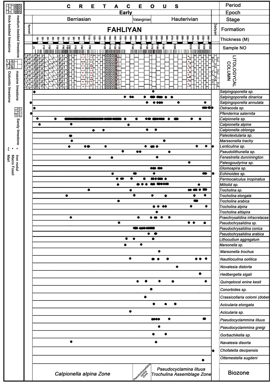 This zone comprises the lower part of Fahliyan Formation in Kuh-e-Siah section in Arsanjan and immediately overlies the dolomitic limestone sediments of Surmeh Formation. As mentioned before, the first presence of Calpionella alpina Lorenz marks the lower biostratigraphic limit of the Fahliyan Formation which is synchronous with disappearance of Pfenderina salernitana (Sartonia and Crescenti). This zone has is measured approximately 185 m and is composed of dolomitic limestone and massive limestone with sandy limestone interlayers. The faunal assemblage of this zone consists of: