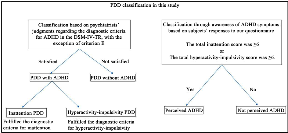 In this study, we divided subjects into three groups as per the psychiatrists’ judgments regarding the presence of ADHD symptoms: ADHD, PDD with ADHD, and PDD without ADHD. In addition, for the subsequent data analysis, we categorized the subjects with PDD, as observed by the attending psychiatrists, as “inattention PDD subjects” if they fulfilled the diagnostic criteria for inattention, and as “hyperactivity-impulsivity PDD subjects” if they fulfilled the diagnostic criteria for hyperactivity-impulsivity. Moreover, based on subjects’ responses tothe questionnaire in this study, we categorized subjects with a total inattention score of ≥6 or a total hyperac-