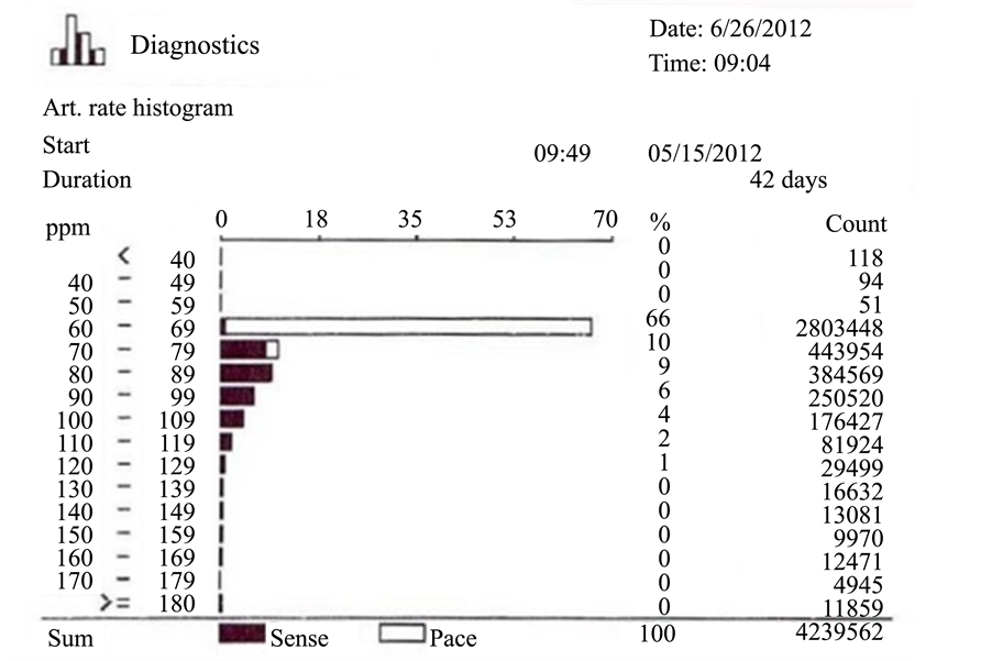 A 27-year-old G1 P0 presented for prenatal care in the first trimester of pregnancy. She had a significant past medical history of bradycardia, hypotension and syncope that required permanent DDD cardiac pacemaker placement 6 years earlier. One year after implant, she had failure of both atrial and ventricular leads secondary to lead-to-lead abrasion and insulation failure. The leads were replaced. She had one episode of left upper extremity venous thrombosis related to replacement of the pacemaker wire 4 years ago, that was treated with short term anticoagulation therapy. A thrombophilia work up revealed an MTHFR compound heterozygous gene mutation. No additional anticoagulation was administered. During the pregnancy the patient was placed on prenatal vitamins and folate supplementation. In the early second trimester, the patient began experiencing light-head- edness and breathlessness with exertion. Pacemaker interrogation showed that the pacemaker was programmed in the DDD mode with a low rate of 60 ppm. She was predominantly atrial pacing at 60 ppm with native AV conduction and entricular sensing. Her heart rate histogram showed relative chronotropic incompetence for a pregnant woman (Figure 1). The basal pacing rate was increased to 80 ppm during the day and 70 ppm during sleep, with resolution of the patient’s symptoms. The remainder of the pregnancy progressed unremarkably. The patient underwent primary cesarean section at 39 weeks gestation with delivery of a healthy term infant. Preoperative anesthesia consultation was obtained. The postoperative course was uneventful. Pre-pregnancy pacemaker settings were re-established after the postpartum period.