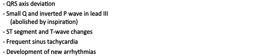 As the pregnancy advances the growing gravid uterus elevates the diaphragm resulting is leftward deviation of the maternal heart in relation to the chest wall. This is reflected on the electrocardiogram (EKG), as shift of QRS axis to the left in the frontal plane [10] . Other EKG changes that have been reported are development of new arrhythmias, frequent sinus tachycardia with accompanying shortened PR and QT intervals, small Q waves and inverted P waves in lead III (abolished by inspiration), increased R/S ratio in leads V1 and V2, sagging of ST segments and inverted or flat T waves in lead III [11] -[15] . Figure 3 summarizes these EKG changes during pregnancy.