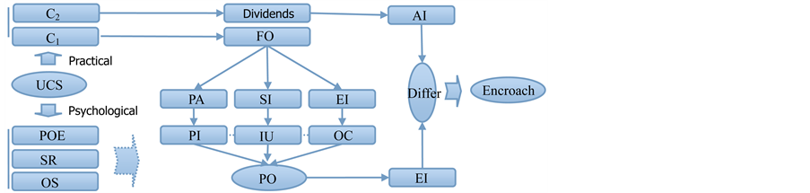 The Logical model above analyses the occupation behaviors at the reality level. UCS stands for the ultimate controlling shareholders. PSS stands for pyramid shareholding structure. while for the analysis of the ultimate controlling shareholders in inner psychological logic model, it requires the use of psychological ownership theory to help the analysis.