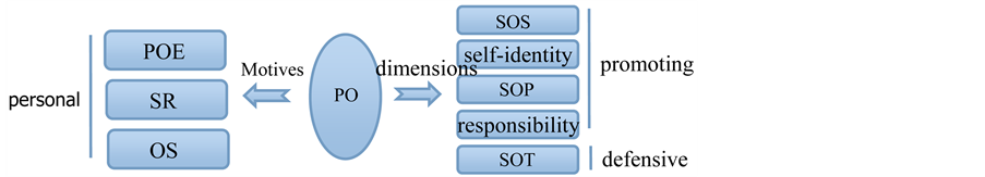 this means that a person’s desire to explore and change the environment. Secondly, the self-recognition (SR): it is the individual identification and definition of himself. The third one is occupied space (OS): this refers that the individual needs to have certain space and he tends to possess the space. Pierce thinks that if people have all the three motives, the psychological ownership will be produced [7] . Avery et al proposes that the psychological ownership has five dimensions which can be divided into two classes, namely promoting psychological ownership and defensive psychological ownership, the former has four dimensions: the sense of self-efficacy (SOS), self-identity, the sense of possession (SOP) and responsibility. The latter dimension is the sense of territory (SOT), which is a kind of psychological defense produced when an individual’s possession of a target is under threats from outside [8] . Figure 3 shows the motives and dimensions of the psychological ownership.
