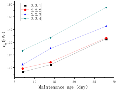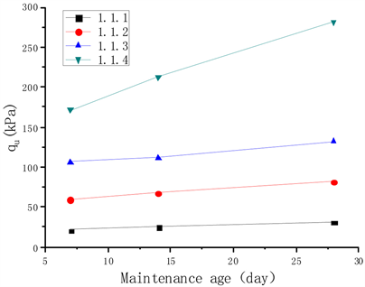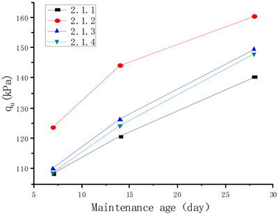 As shown in Figures 9-11, the unconfined compression strength of the solidified sludge is enhanced with the increase of age under the three different curing agent dosages. From Figure 12, in the same set of tests, the strength of the solidified sludge at 28 days of age is about 1.34 times the intensity of 7 d in the age, i.e.: qu28 = 1.34qu7, and the intensity at 14 d is about 1.12 times that at 7 d, that is, qu14 = 1.12qu7.