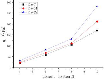 Table 4 shows the unconfined compression strength values of solidified soils with different formulations at different ages. Figure 4 shows the relationship between the unconfined compression strength of solidified soil and the amount of cement added. In the three stages of different ages, the unconfined compression strength of the solidified sludge is increasing during the process of increasing the cement content from 4% to 10%, and the growth rate is above 60%, up to 173.18%. When the cement content increased from 8% to 10%, the growth rate of each of the three curves was above 110%. It can be seen that the strength of