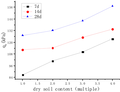 Figure 6 shows the relationship between the solidified sludge strength and the dry soil content. When the age was 7 d, the strength of the solidified sludge increased by 0.06%, 2.41%, 2.66%, 10.07% compared with the non-incorporated dry soil. The dry soil content was positively correlated with the solidified sludge strength. Under the dry soil content of 4 times the cement dosage, the unconfined compression strength at 7 d, 14 d and 28 d was increased by 16.42%, 19.79%, 19.22% compared with that when not mixed with dry soil.